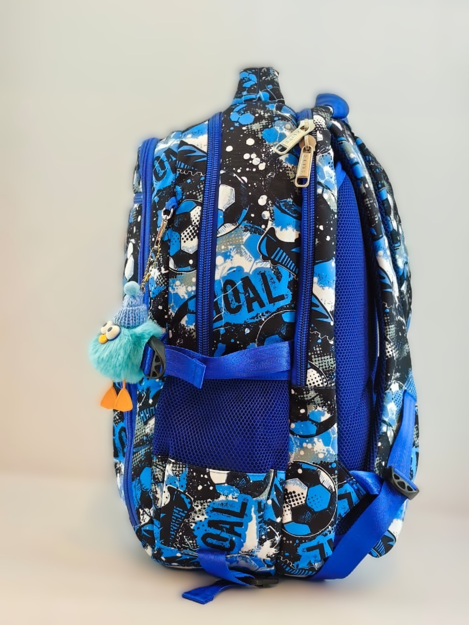 - الإضافات: تأتي مع ميدالية لطيفة ومرحة على شكل طائر أزرق يرتدي قبعة صوفية، مما يضيف لمسة مميزة ومحببة للحقيبة.