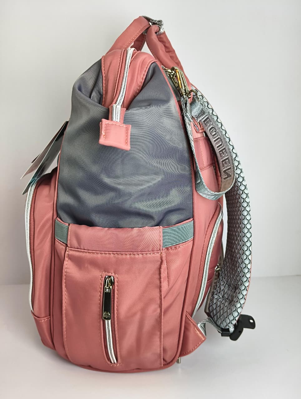 - التنظيم: الحقيبة مقسمة من الداخل بجيوب متعددة لتنظيم كافة مستلزمات البيبي، وتحتوي على جيب أمامي حراري وجيوب جانبية لسهولة الوصول للمناديل المبللة.