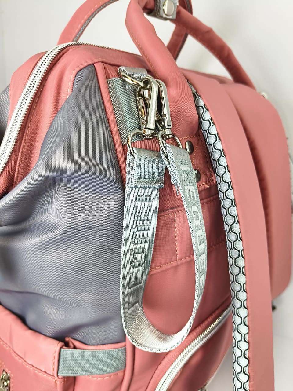 . حقيبة الظهر الرئيسية: تتميز بتصميم “دايموند” مع سحابات فضية مدموغة بشعار العلامة التجارية وبطانة داخلية بعلامة مائية.