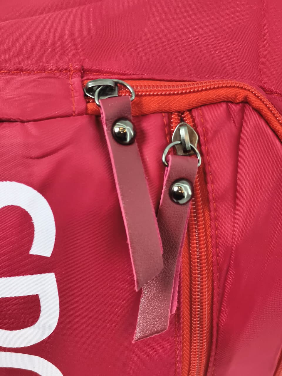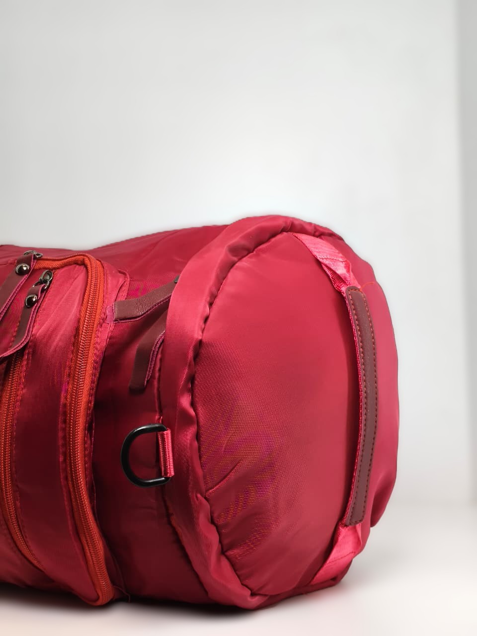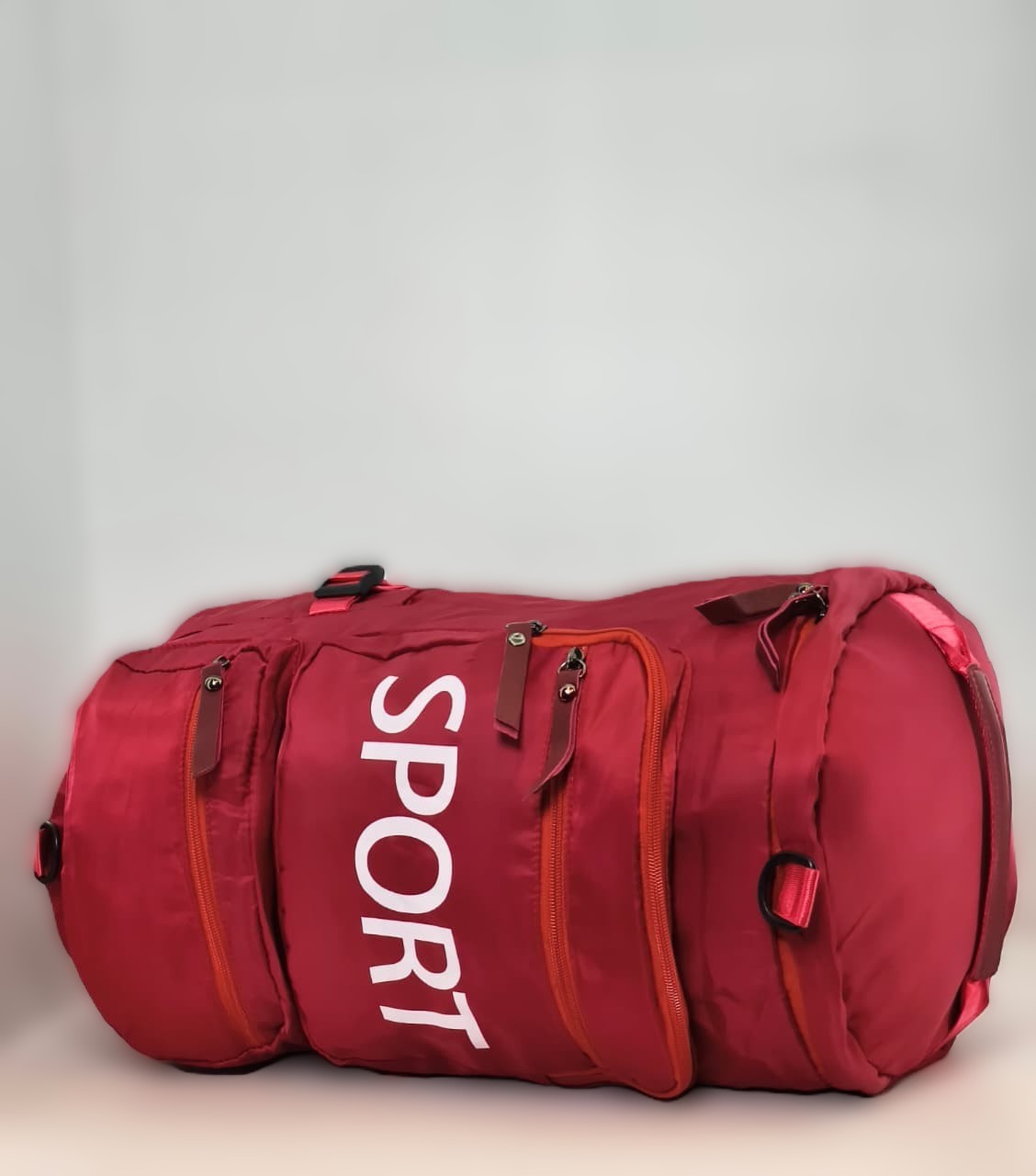 - التصميم: تتميز الحقيبة بشكل أسطواني ولون أحمر داكن (نبيتي) مع كلمة “SPORT” مطبوعة بشكل رأسي بارز.