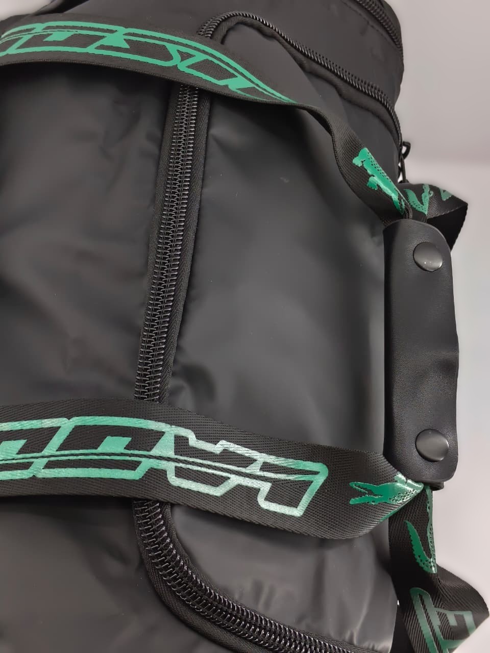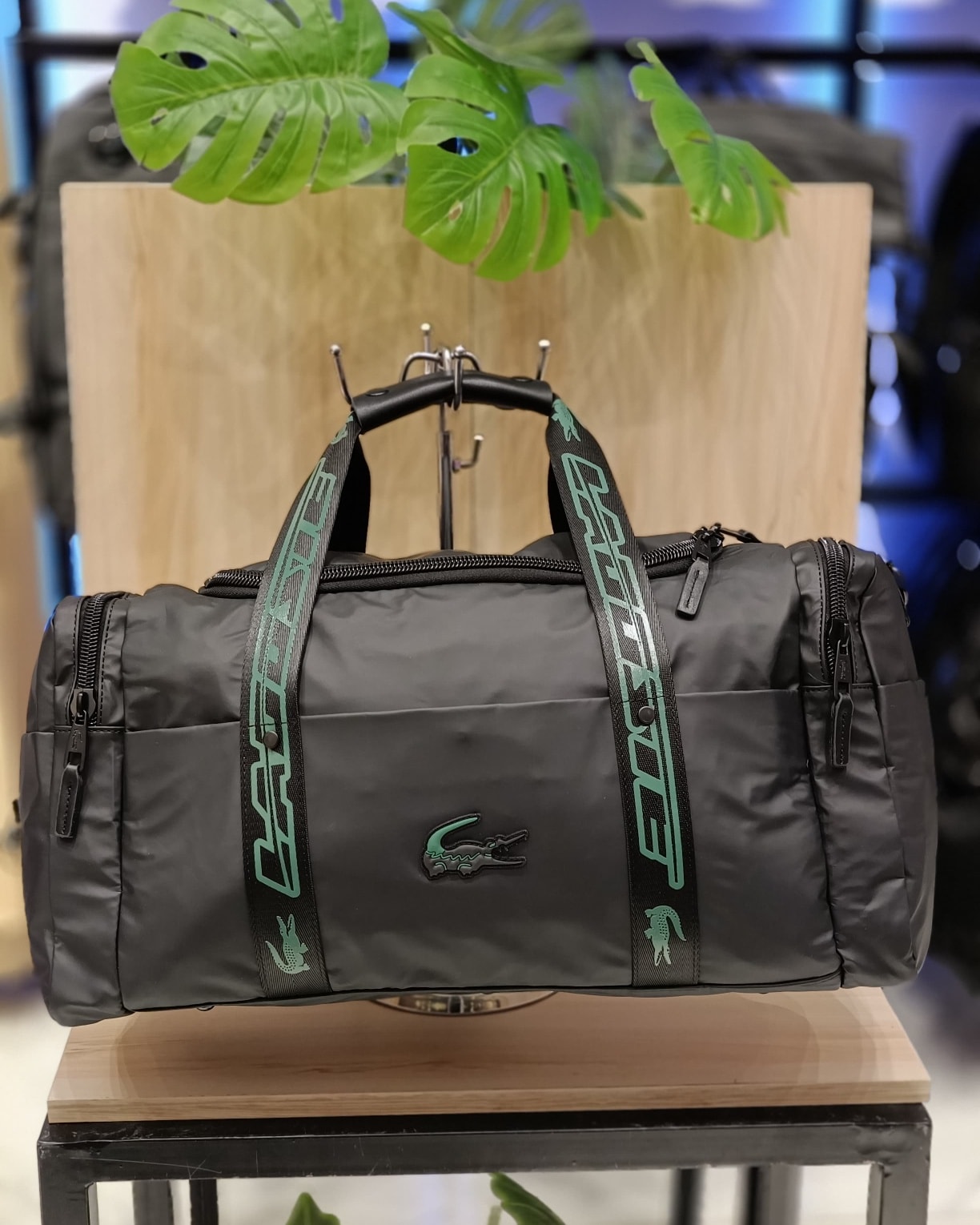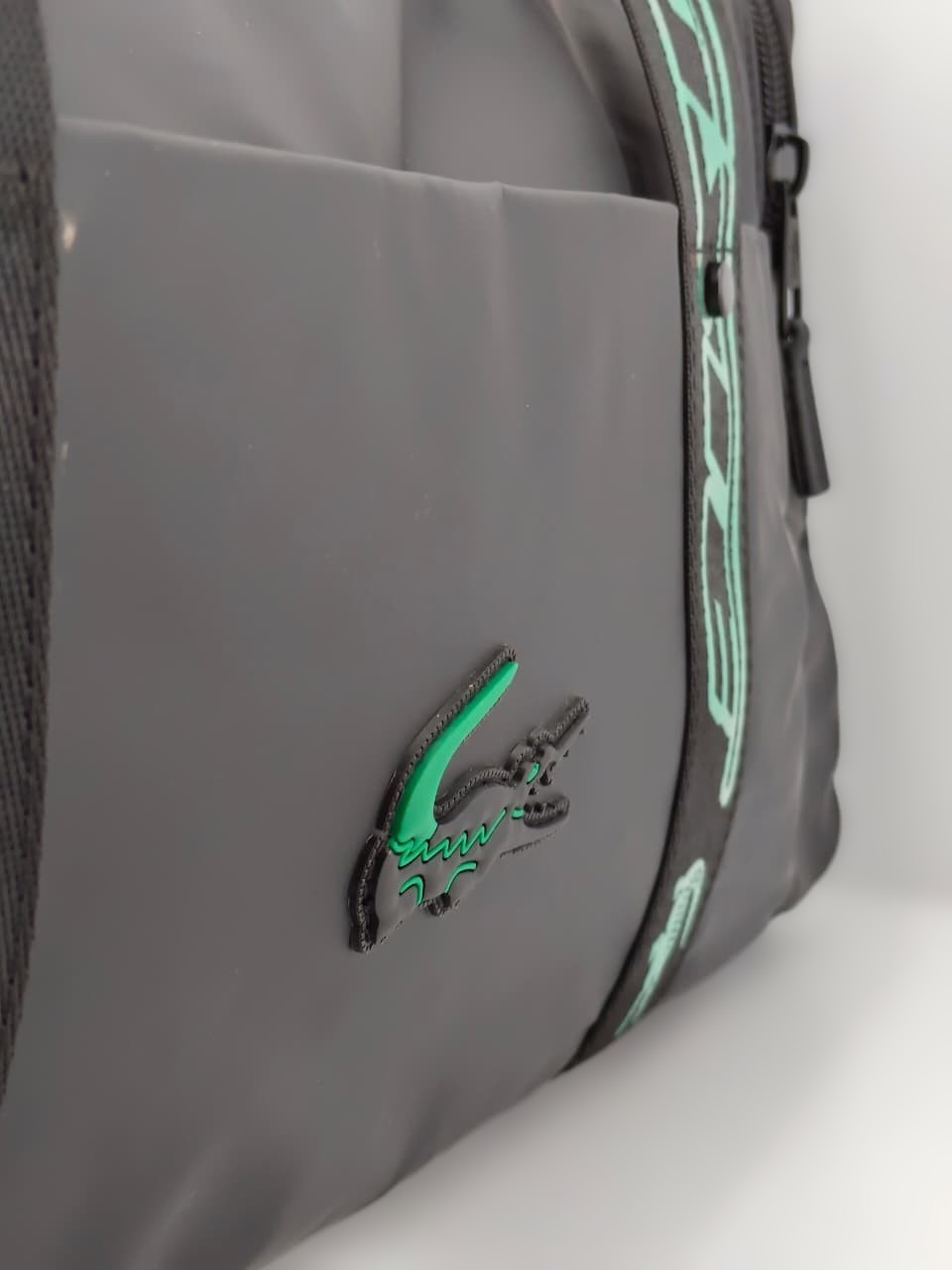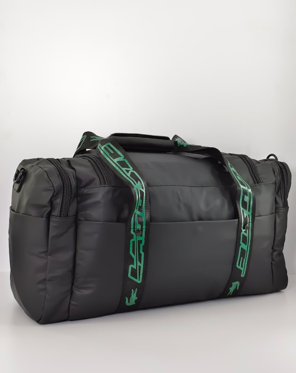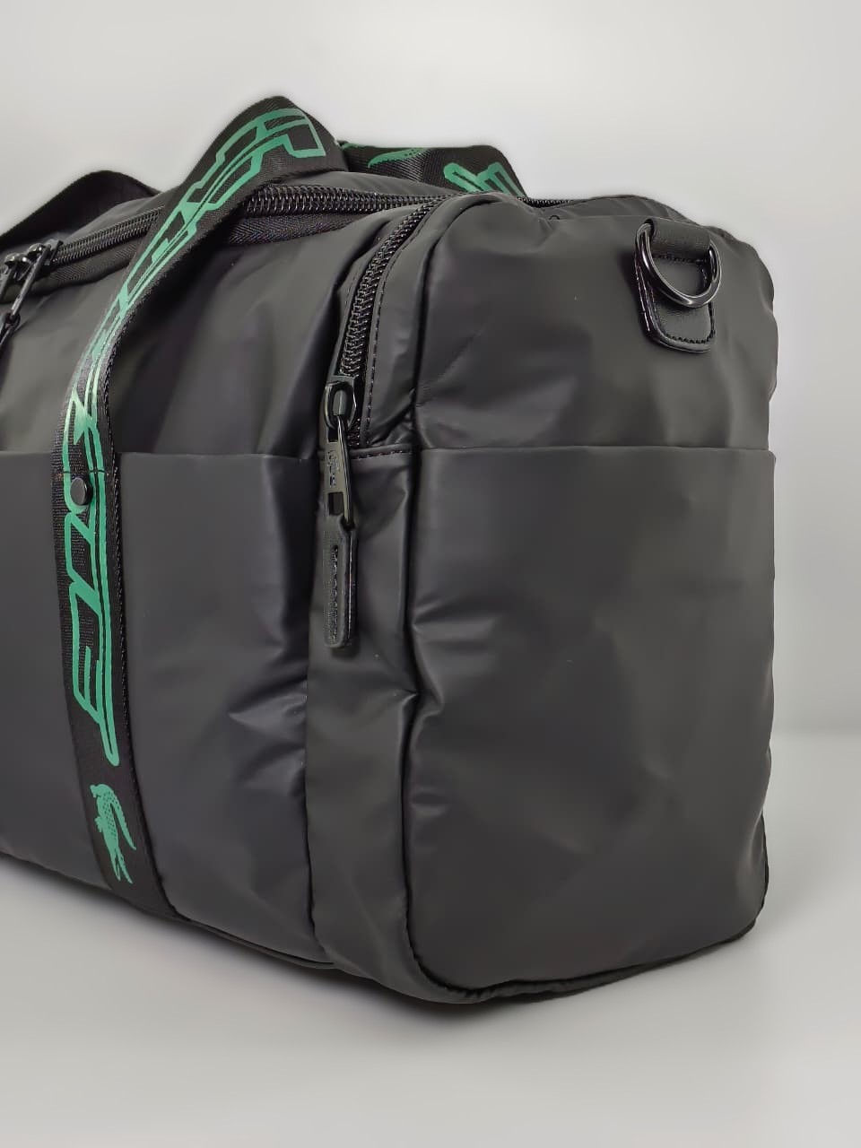 • التصميم: تأتي باللون الأسود مع أحزمة كتف خضراء تحمل شعار “LACOSTE” المطبوع، وشعار التمساح الأخضر المطرز الأيقوني في المنتصف.