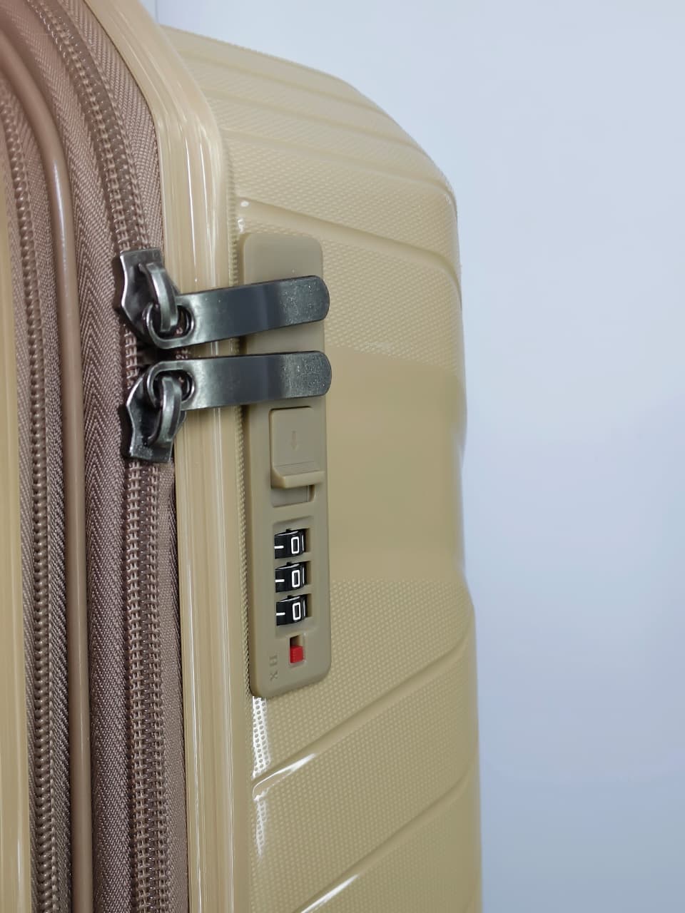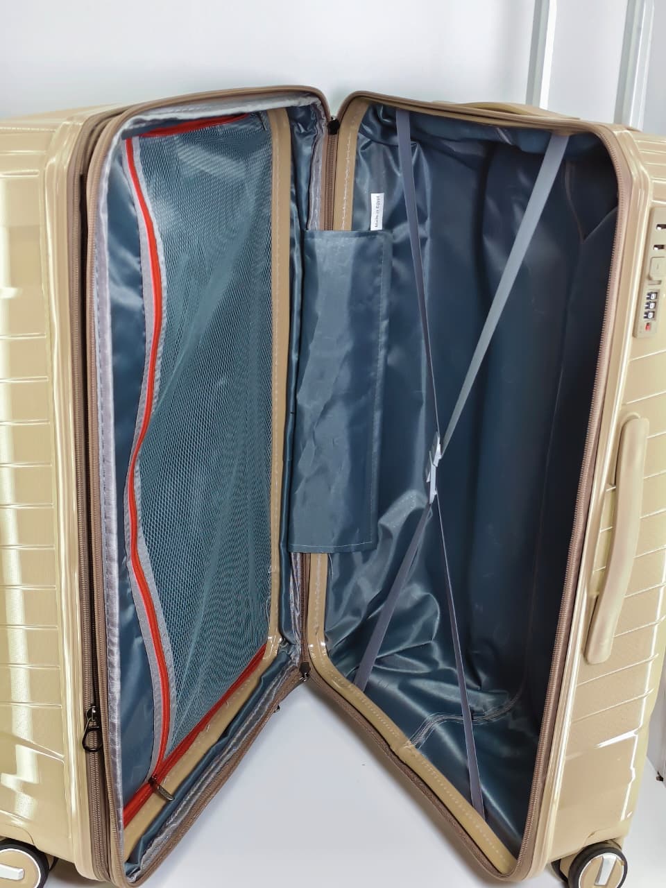 • الخامة: الحقيبة مصنوعة من مادة البولي كربونات (Polycarbonate)، وهي مادة قوية جداً ومرنة في نفس الوقت، مما يجعلها “ضد الكسر” وقادرة على تحمل ضغط الشحن في المطارات.