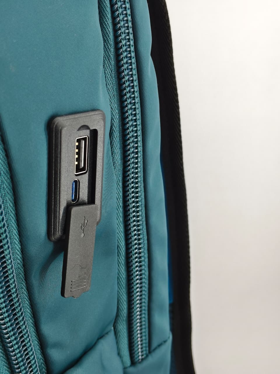 • المميزات التقنية: تظهر الصورة وجود منفذ USB خارجي على جانب الحقيبة، مما يسمح بشحن الهاتف بسهولة أثناء الحركة.