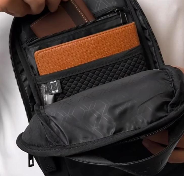 جيب رئيسي واحد يتكون من جيب ايباد يتسع حتى 24.6 سم وجيب للجوال وجيب شبكي ومساحة رئيسية للمنتجات المختلفة مثل اليوميات والباور بانك والساعات والأقلام وجواز السفر والمحفظة والمفاتيح وبطاقة الهوية والوجبات الخفيفة الصغيرة وغيرها من المتعلقات الشخصية الصغيرة وجيب أمامي واحد وجيب واحد للبطاقات على حزام الكتف وجيب سري مضاد للسرقة على الظهر لحماية أغراضك القيمة.