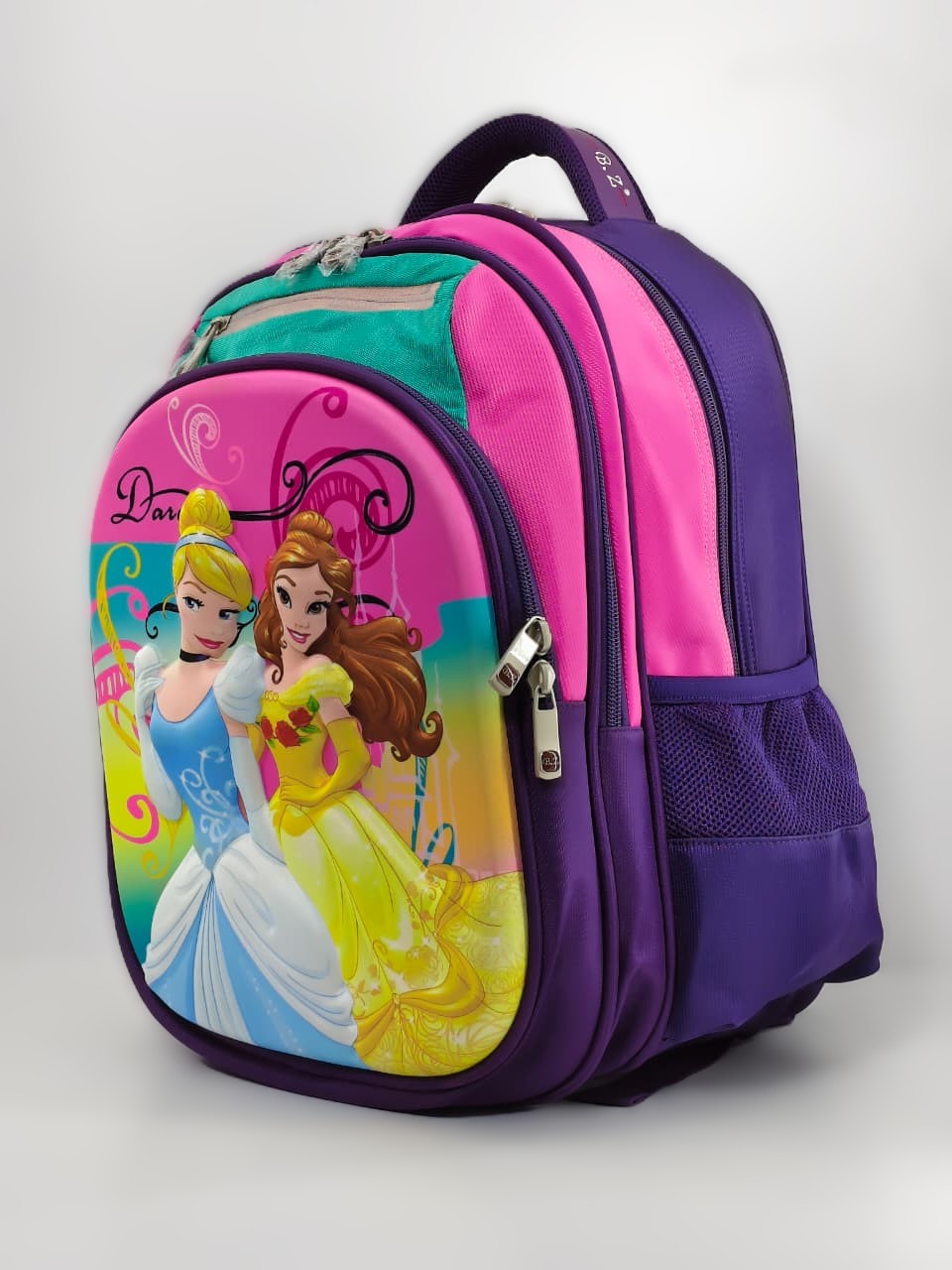 - التصميم: تأتي الحقيبة باللونين البنفسجي والوردي، وتبرز فيها الرسومات الكرتونية للأميرات بتقنية 3D لإعطاء شكل مجسم وجذاب.