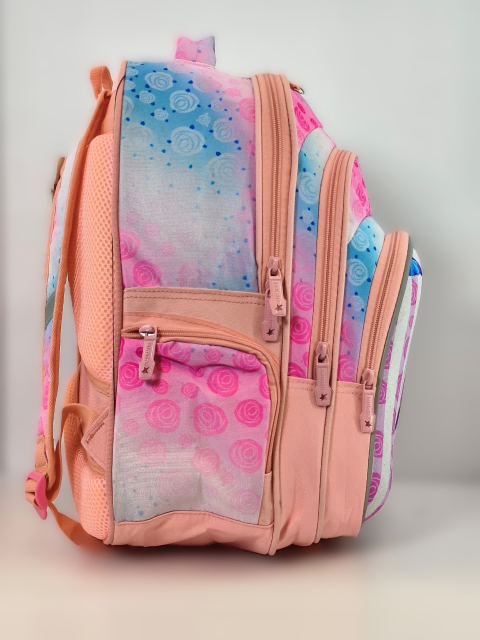- التصميم: تتميز الحقيبة بتفاصيل كرتونية بارزة، مع خلفية مخططة باللونين الفضي والأرجواني في الجزء الأمامي، ونقوش ورود وردية تزين الواجهة.