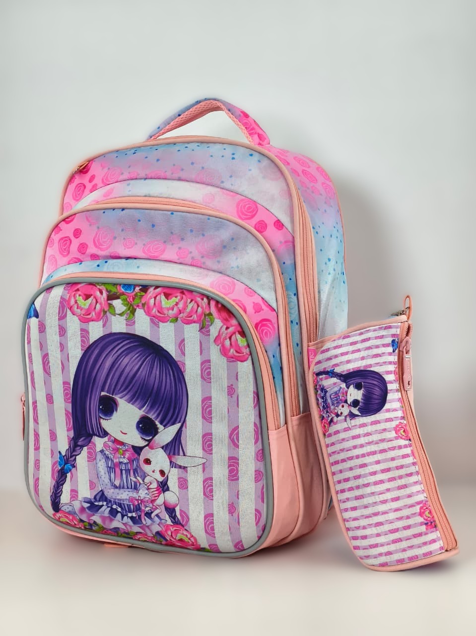 - المكونات: يشتمل الطقم على حقيبة ظهر متعددة الجيوب ومقلمة (حافظة أقلام) بتصميم مطابق تماماً يصور شخصية فتاة “أنيمي” لطيفة تحمل أرنباً.