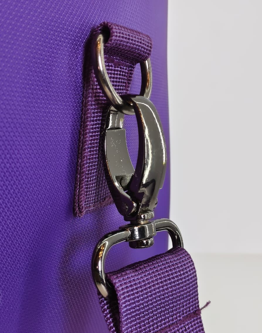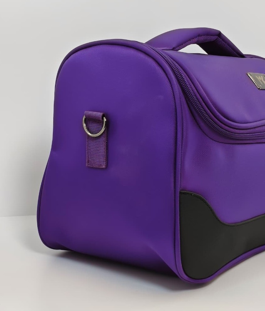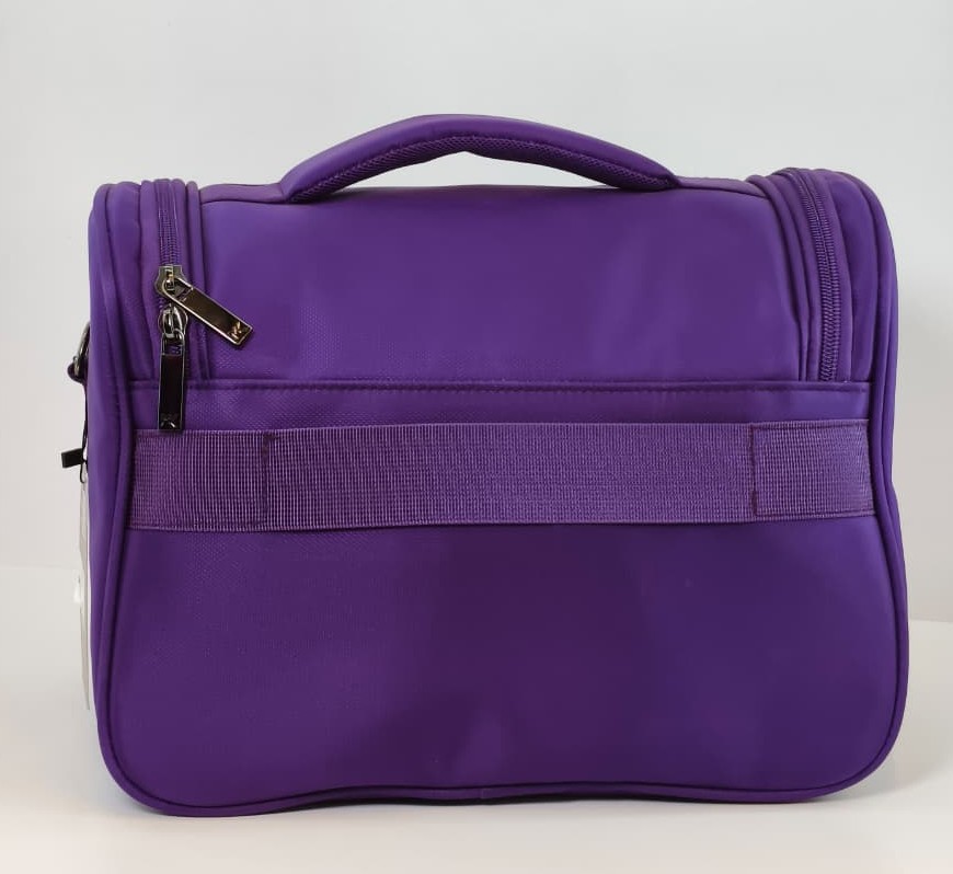 حقيبة مكياج أو حقيبة أدوات تجميل للسفر متعددة الاستخدامات. تتميز هذه الحقيبة بتصميم واسع ولون بنفسجي جذاب مع تفاصيل سوداء، وهي مصممة لتنظيم مستحضرات التجميل أو كحقيبة غداء حرارية في بعض الموديلات المشابهة.