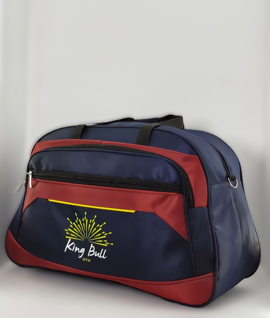 تُظهر الصورة حقيبة هاند باج (Duffel Bag) من العلامة التجارية كينج بول (King Bull)، وهي حقيبة سفر ورياضة عملية تتميز بتصميم عصري يدمج بين اللونين الكحلي والأحمر.