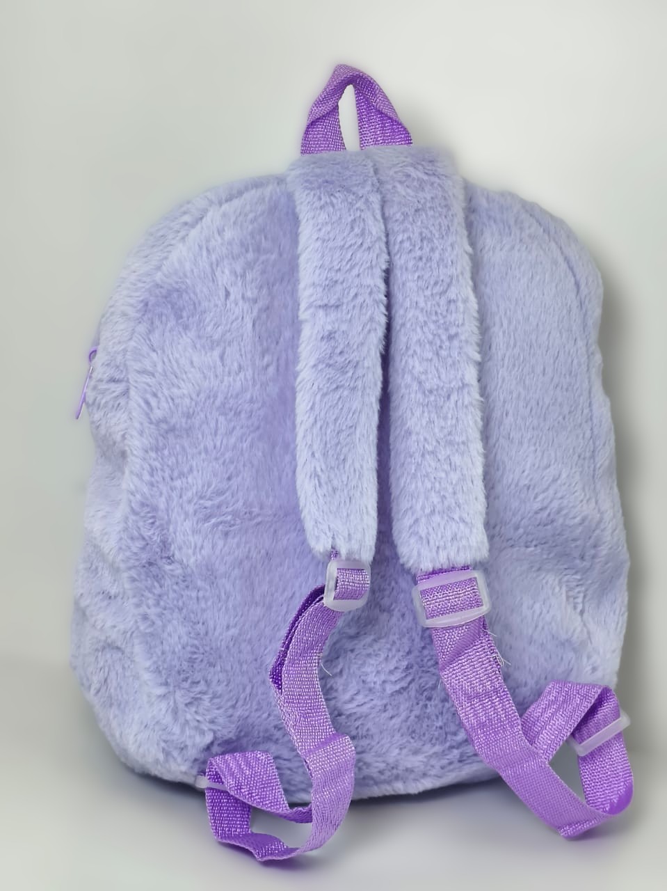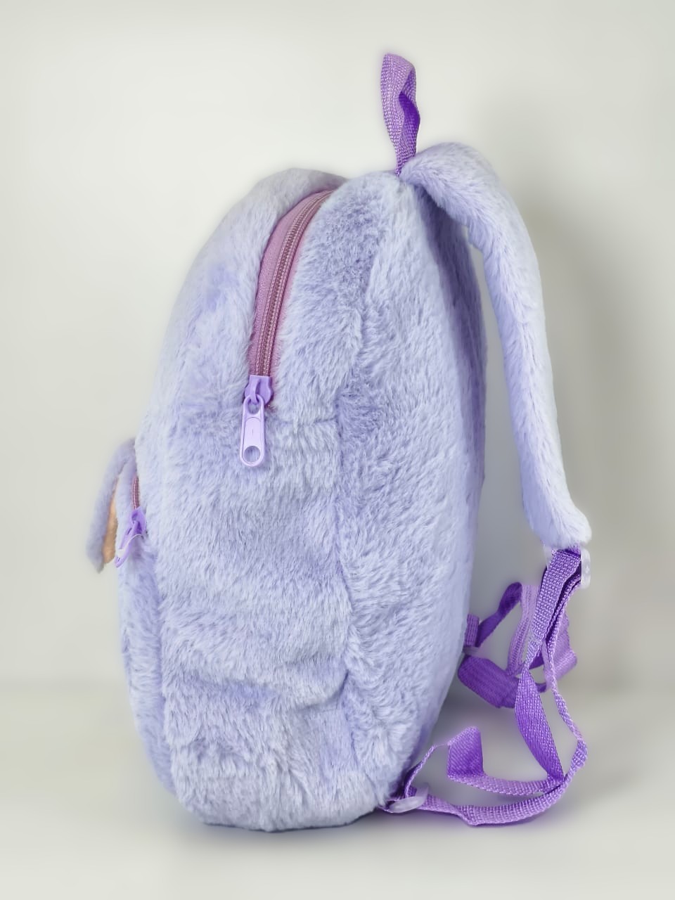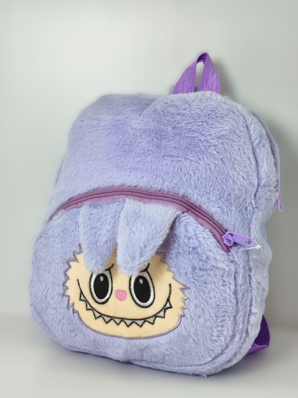 - التصميم والخامة: الحقيبة مصنوعة من فراء صناعي (أو قطيفة) ناعم جداً باللون الأرجواني (اللافندر)، مما يجعلها خفيفة الوزن ومريحة جداً على ظهر الطفل. تتميز بوجه الشخصية المطرز مع “آذان” بارزة وسوستة متينة.