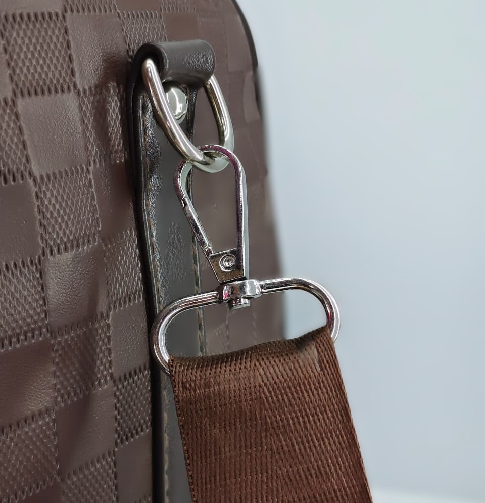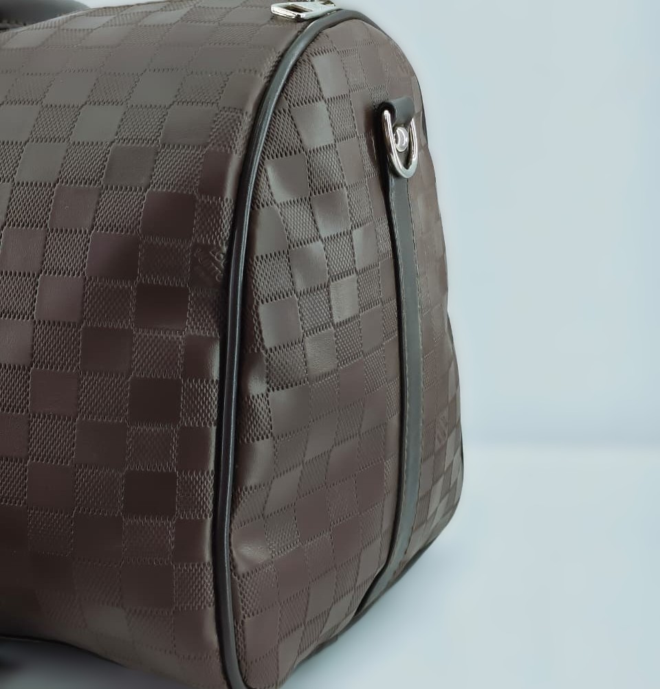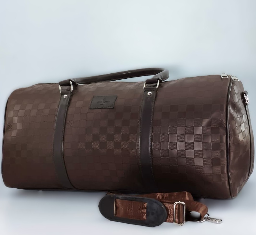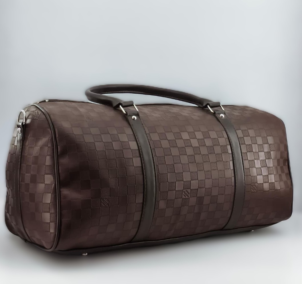 حقيبة “دفل” (Duffle Bag)، وتتميز بتصميم المربعات الكلاسيكي (Damier) الذي اشتهرت به علامة لويس فيتون (Louis Vuitton)، وهي مثالية للسفر القصير أو للجيم