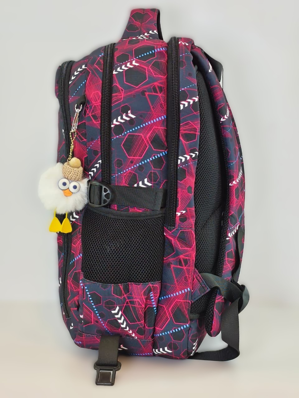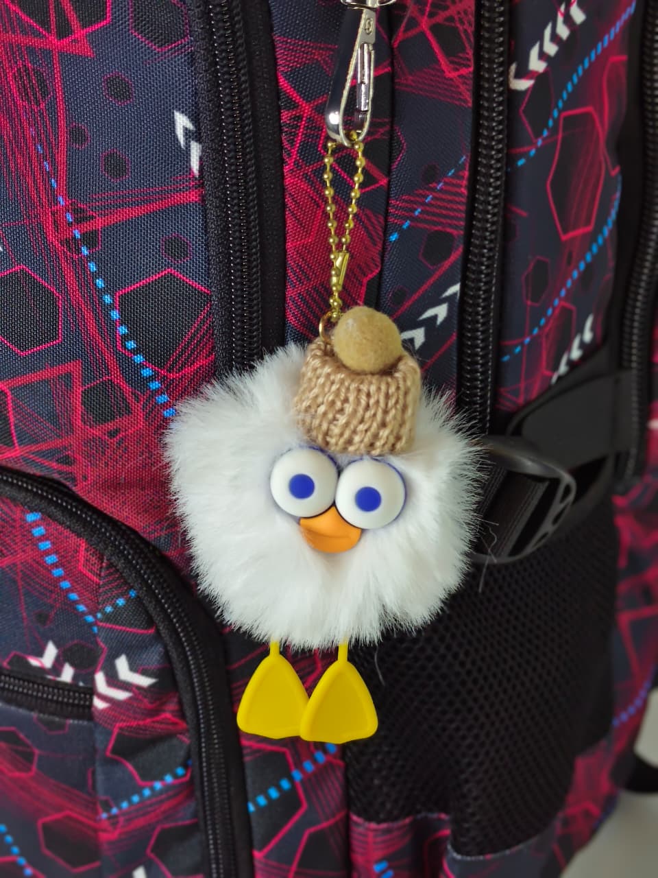 - الإضافات: تأتي مع ميدالية لطيفة على شكل طائر أبيض صغير يرتدي قبعة صوفية وصفراء، مما يضيف لمسة من المرح والتميز للحقيبة.