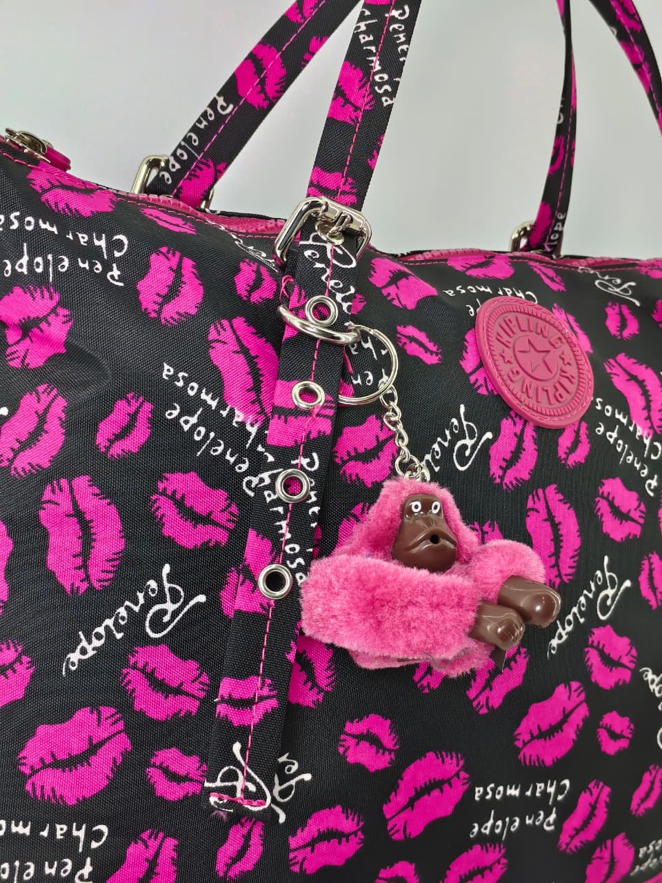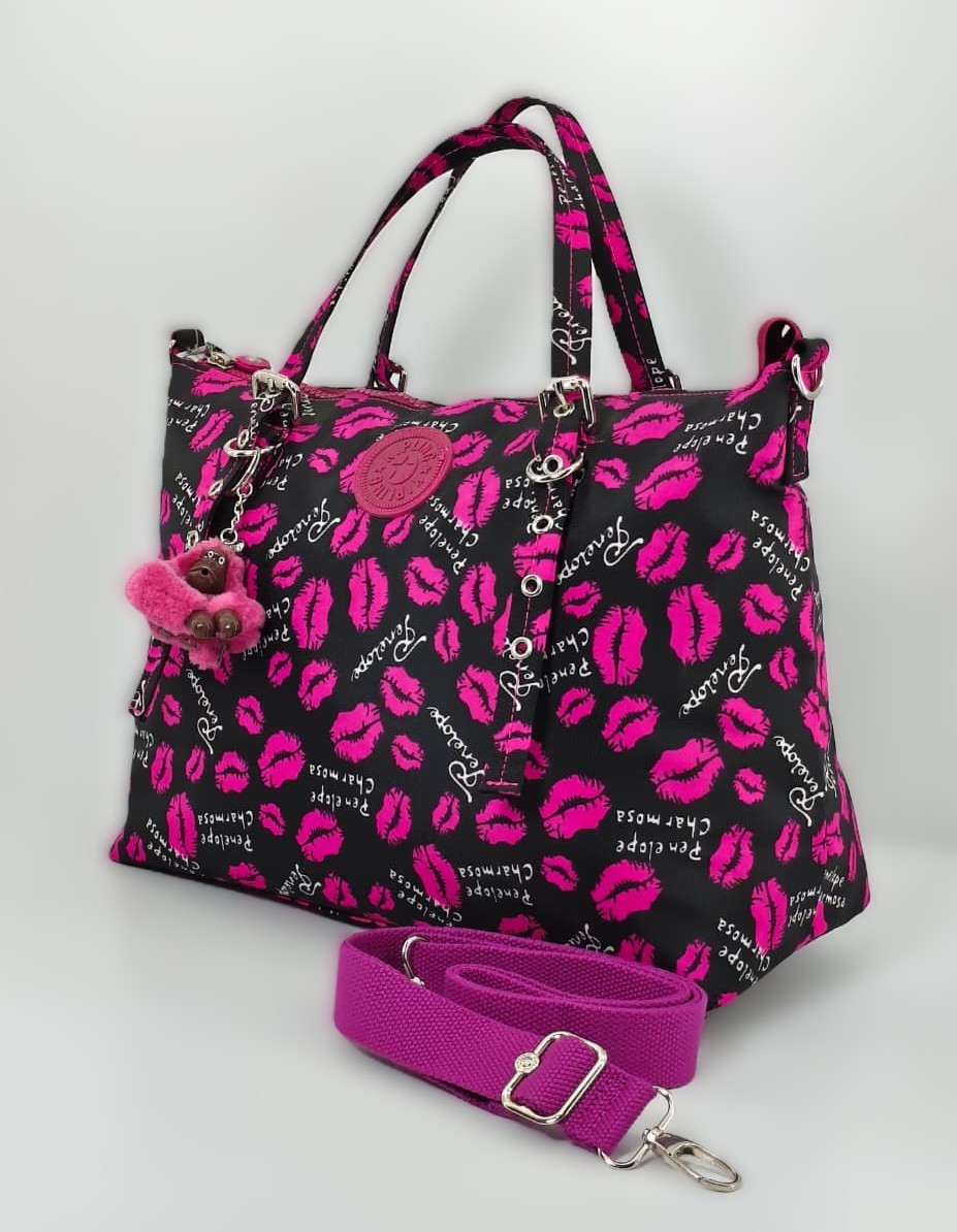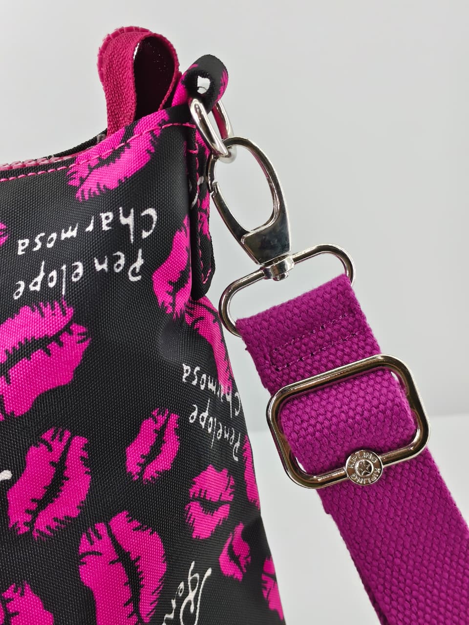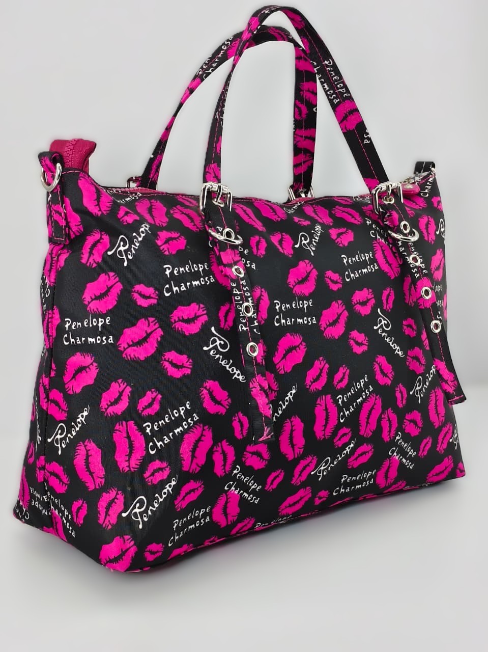 - النقشة: مطبوعة بالكامل برسومات شفاه (Lips) باللون الوردي الفوشيا (Hot Pink)، مع كتابة اسم “Penelope Charmosa” بخط أنيق ومتكرر.