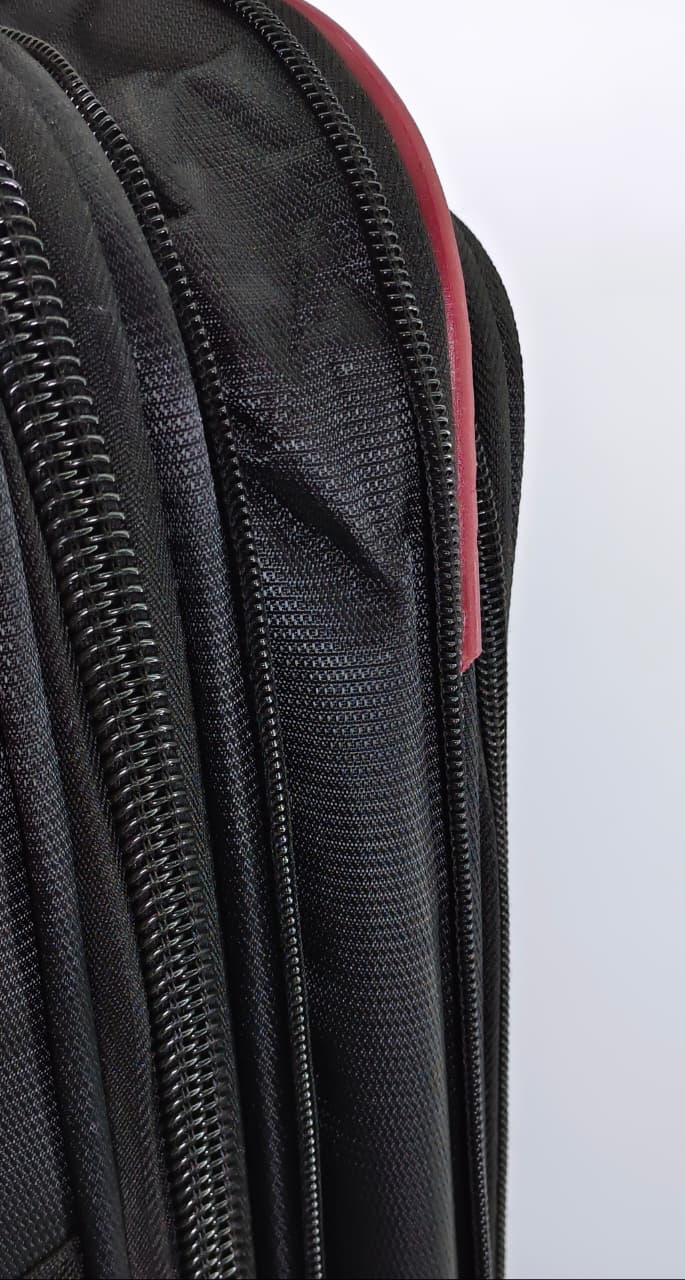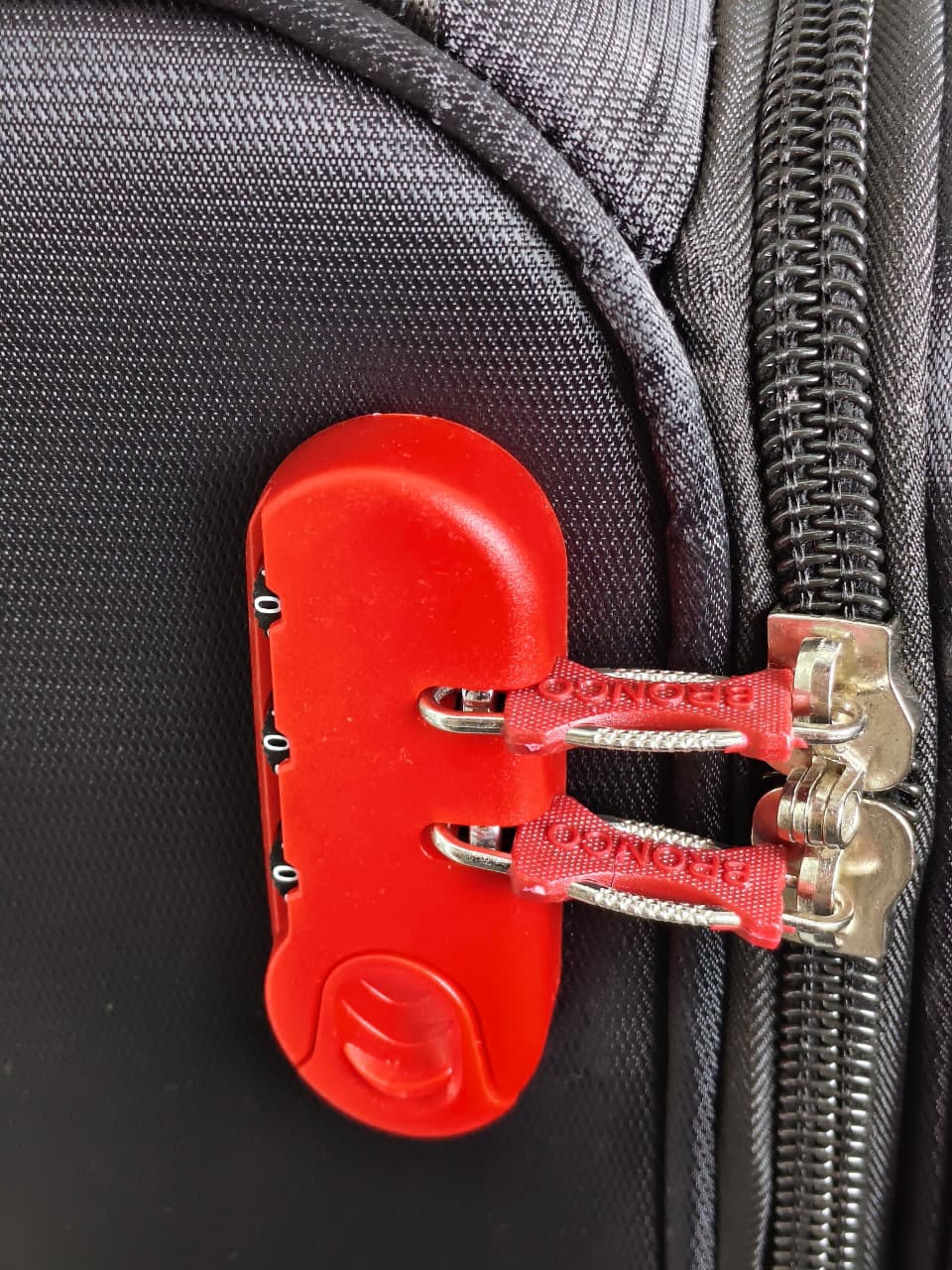 • التصميم: يتميز بنمط “الكاروهات” أو المربعات البيضاء على خلفية سوداء، مع لمسات باللون الفوشيا أو الأحمر الصارخ في المقبض، السحابات، والعجلات، مما يسهل تمييزها على سير الحقائب في المطار.