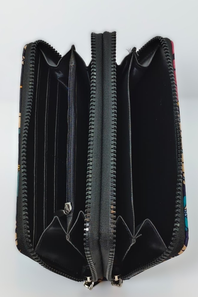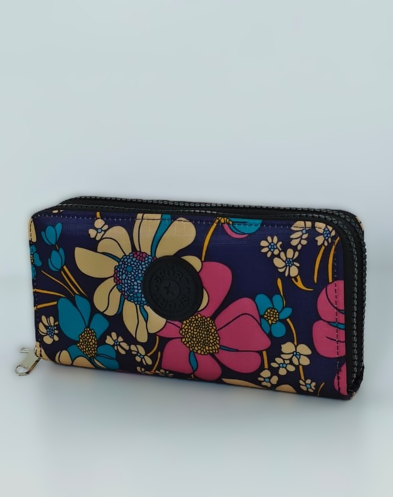 محفظة نسائية طويلة بنقوش أزهار زاهية، وهي تصميم مستوحى بشكل كبير من ماركة كيبلينج (Kipling) الشهيرة، أو قد تكون من الماركات التي تستخدم خامات “الووتر بروف” المشابهة